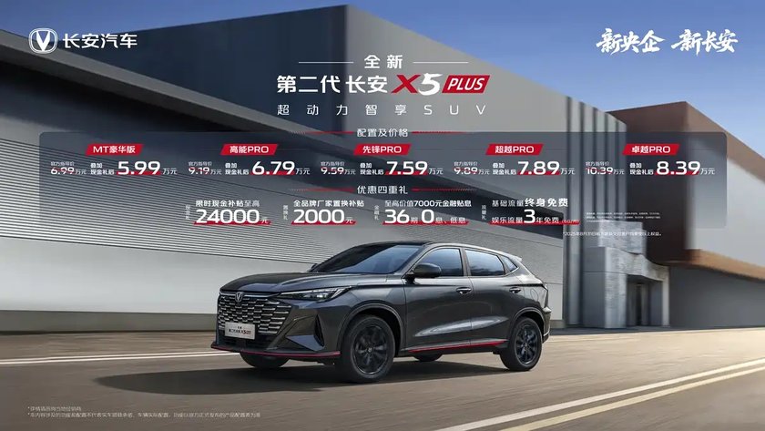 8月18日,2026款长安X5 PLUS正式上市了,新车共推出5款车型,售价区间为6.99-10.39万元,同时官方还给出了限时优惠区间为5.99-8.39万元。作为一台紧凑型SUV,而且中高配还是1.5T发动机,再结合这个售价,性价比真的非常高了。另外,新车还有36期0息、低息;终身免费基础流量、3年免费娱乐流量(6G/月)等权益(具体可看下图),可以说长安非常有诚意了。至于新车到底如何,我们接着看下去。