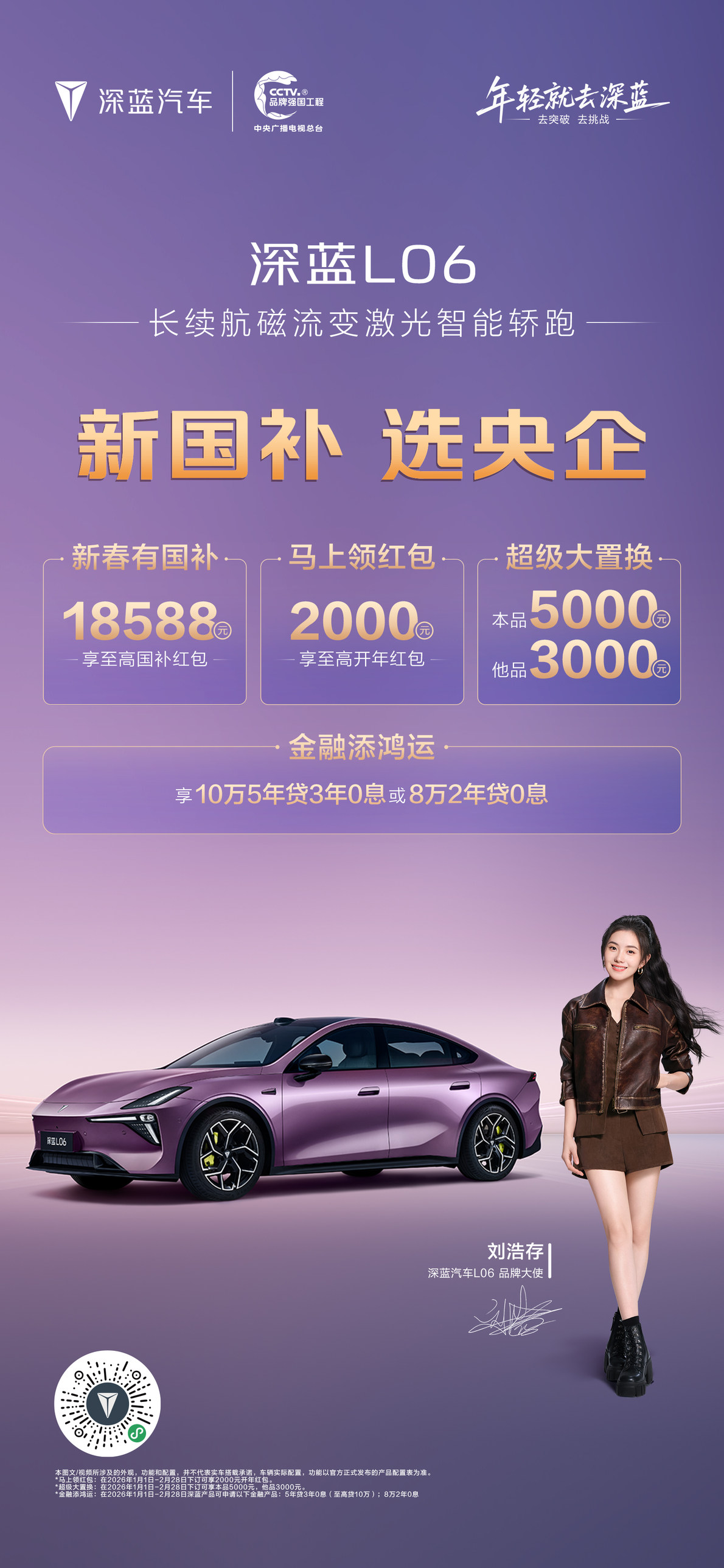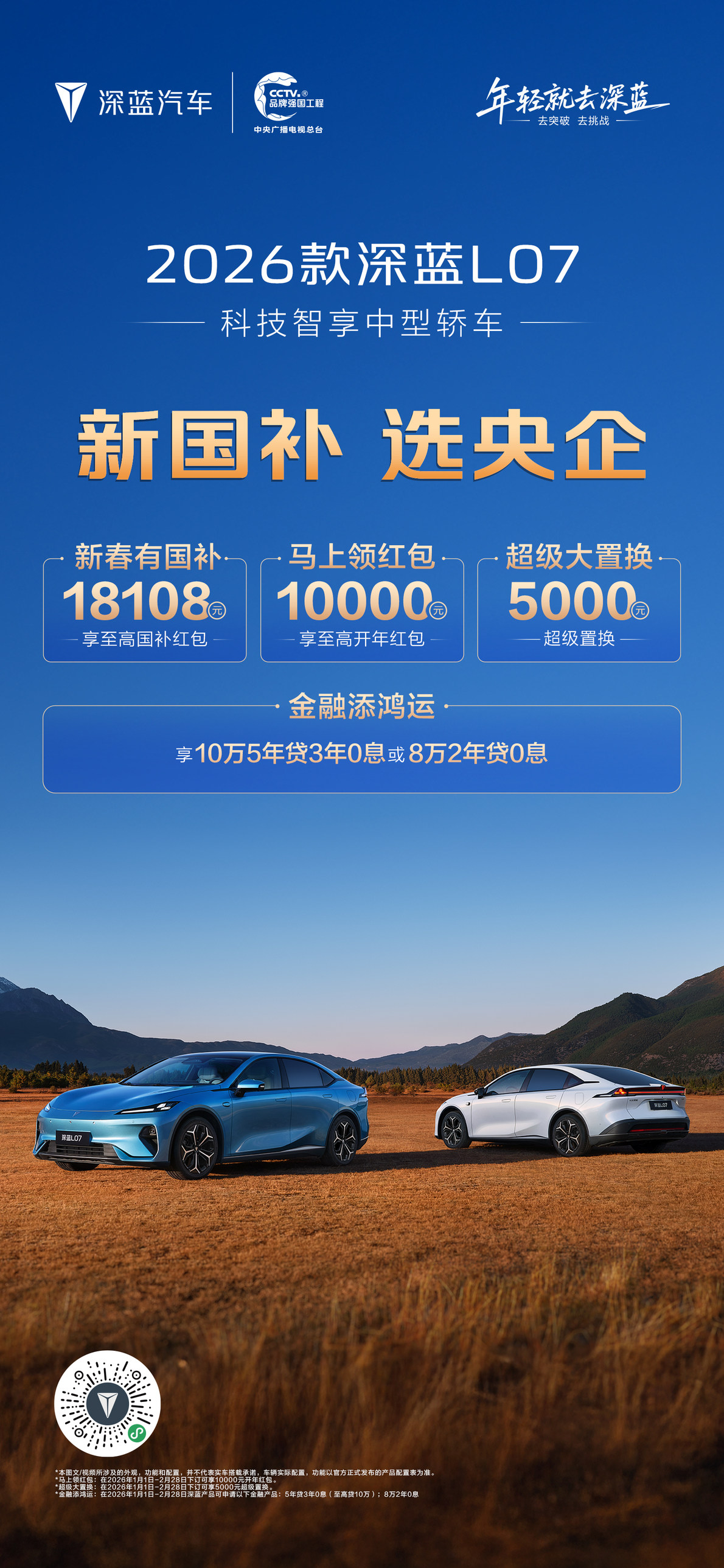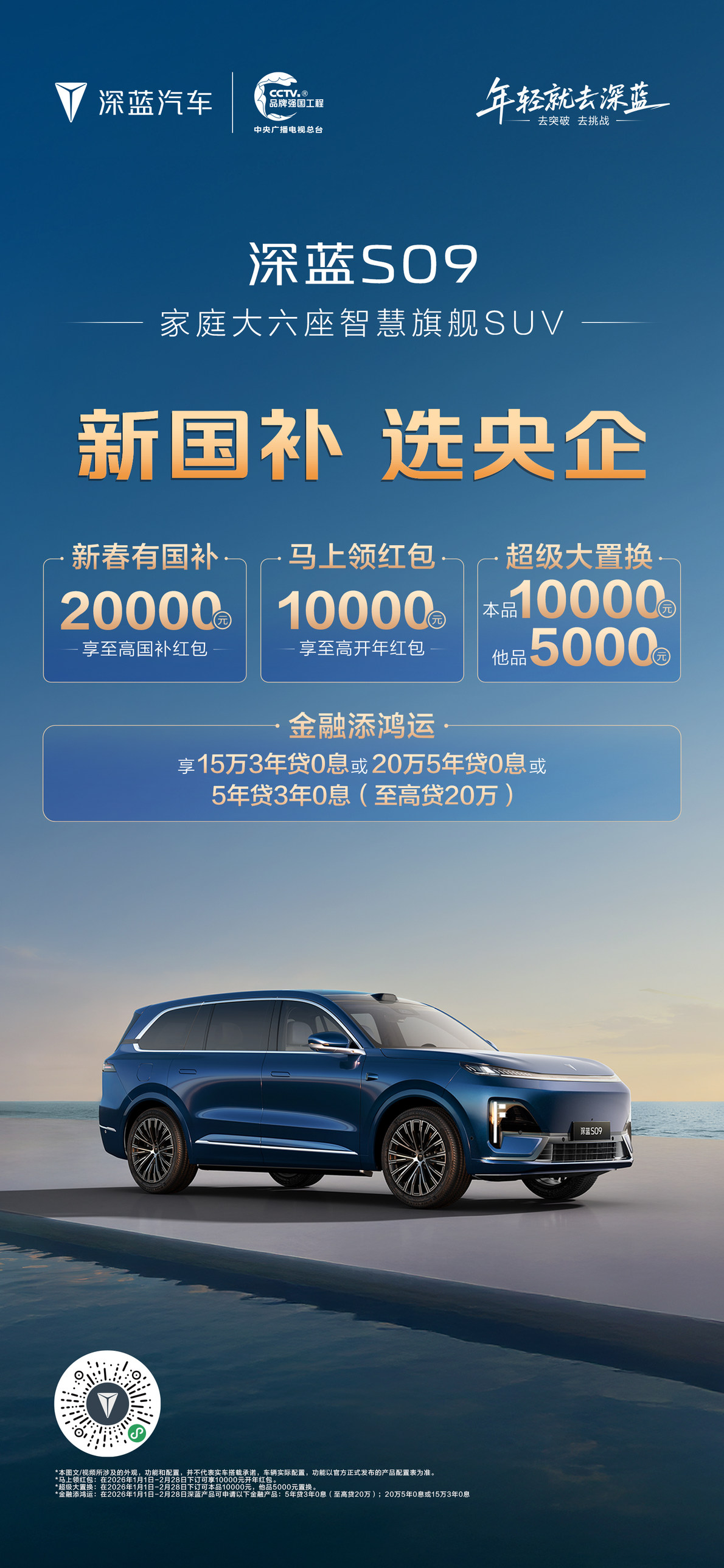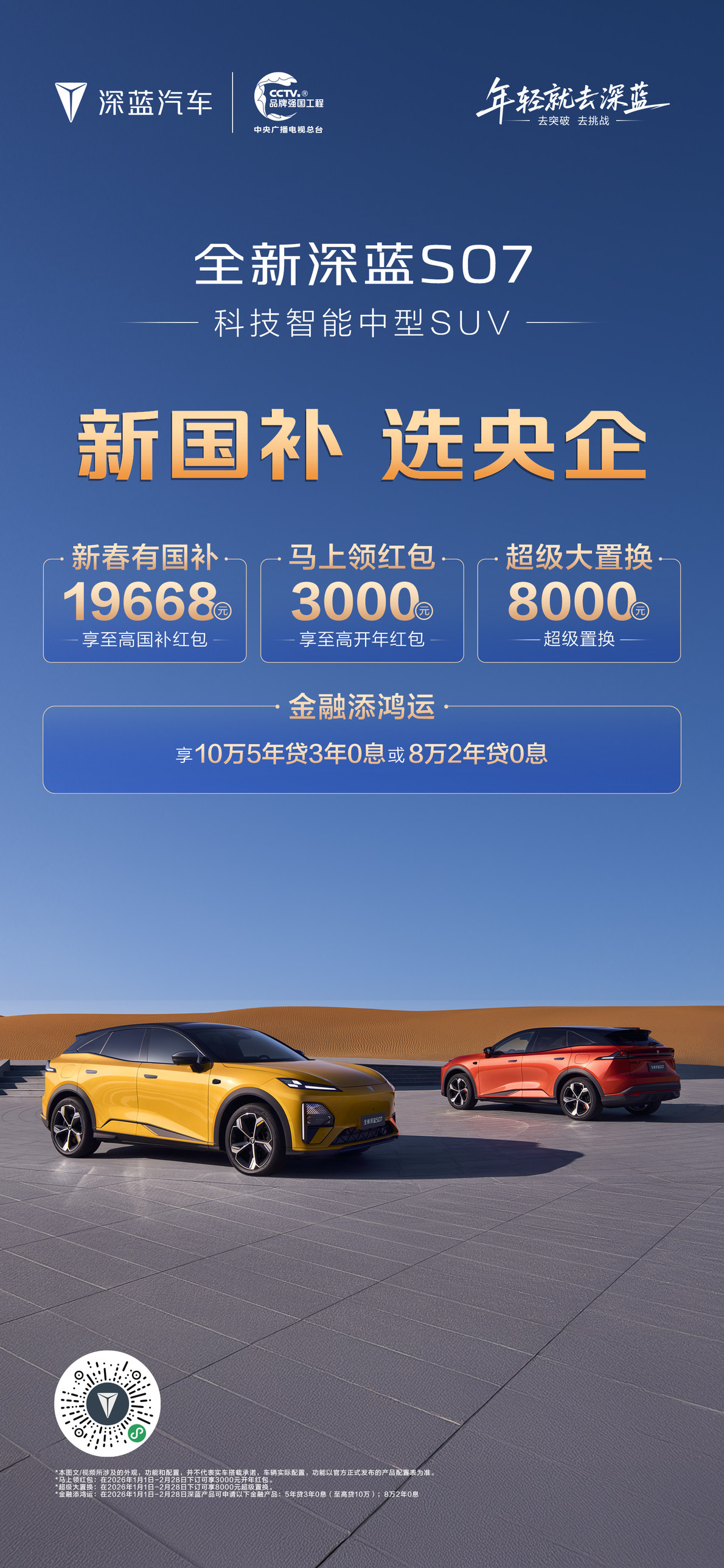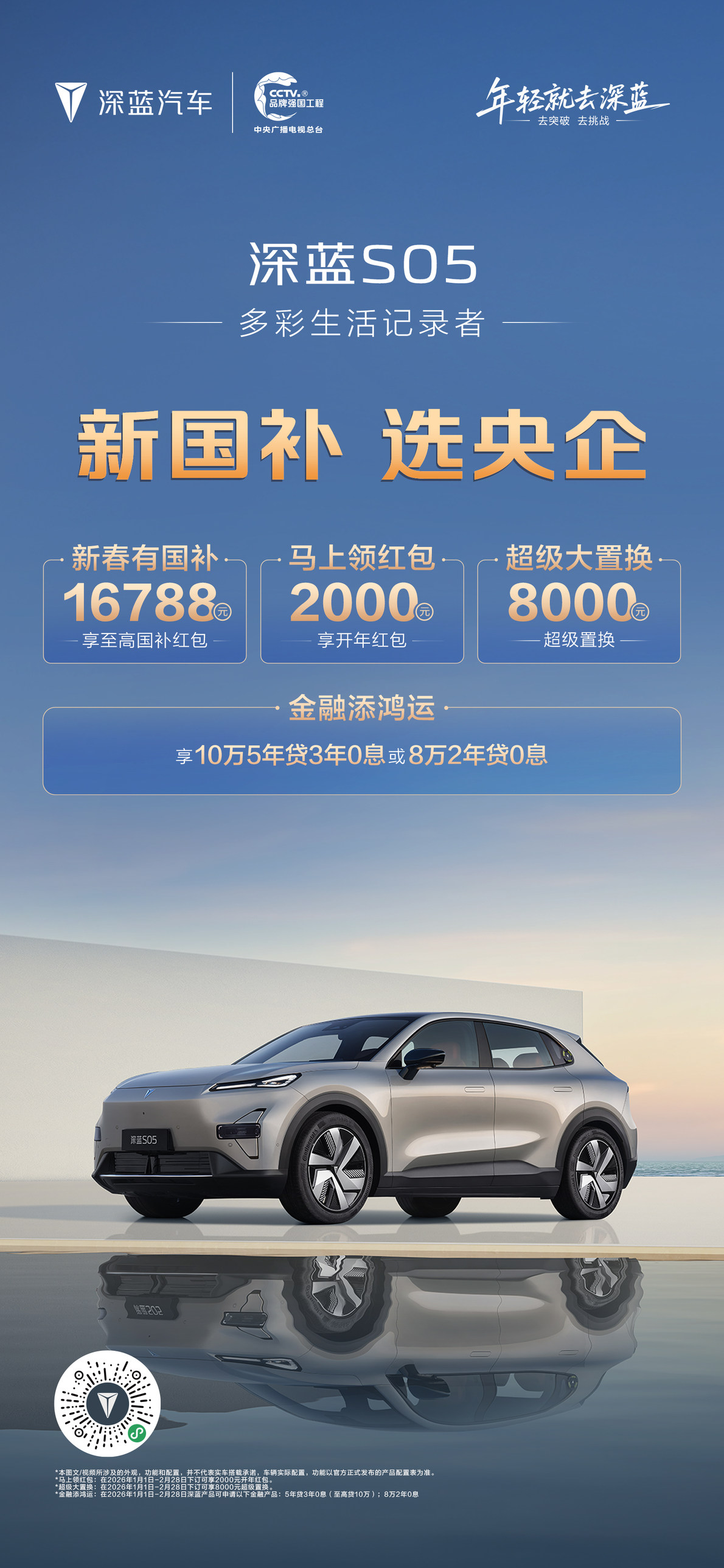 本次政策以“新国补 选央企”为主题,具体权益涵盖:可享至高20000元的“新春有国补”红包、至高10000元的“马上领红包”开年红包、至高8000元的“超级大置换”补贴,以及“金融添鸿运”提供的至高5年0息等多种优惠方案,用户在2026年1月1日至2月28日期间下订可享。深蓝汽车始终以用户为中心,本次政策的推出,旨在切实降低用户购车门槛,提升消费体验。新央企,响应新国补,诚意献礼!领国补:至高20000元,领红包:10000元;享置换:至高8000元,分期付:至高5年0息;实力宠粉,轻松开启新年!#新国补选央企 #深蓝汽车