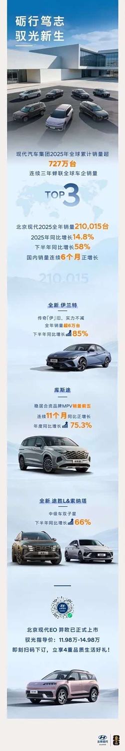 而2026年开年,东风日产、上汽大众、北京现代等合资品牌却发出2025年逆势增长的销量海报,其中北京现代在2025年同比增长14.8%的全年销售数据之外,还详细罗列了旗下主力车型的销量成绩:全新伊兰特全年销售超6万台、库斯途全年同比增长75.3%、全新途胜L&索纳塔下半年同比增长66%,首款新能源转型战略落地车型EO 羿欧已正式上市。