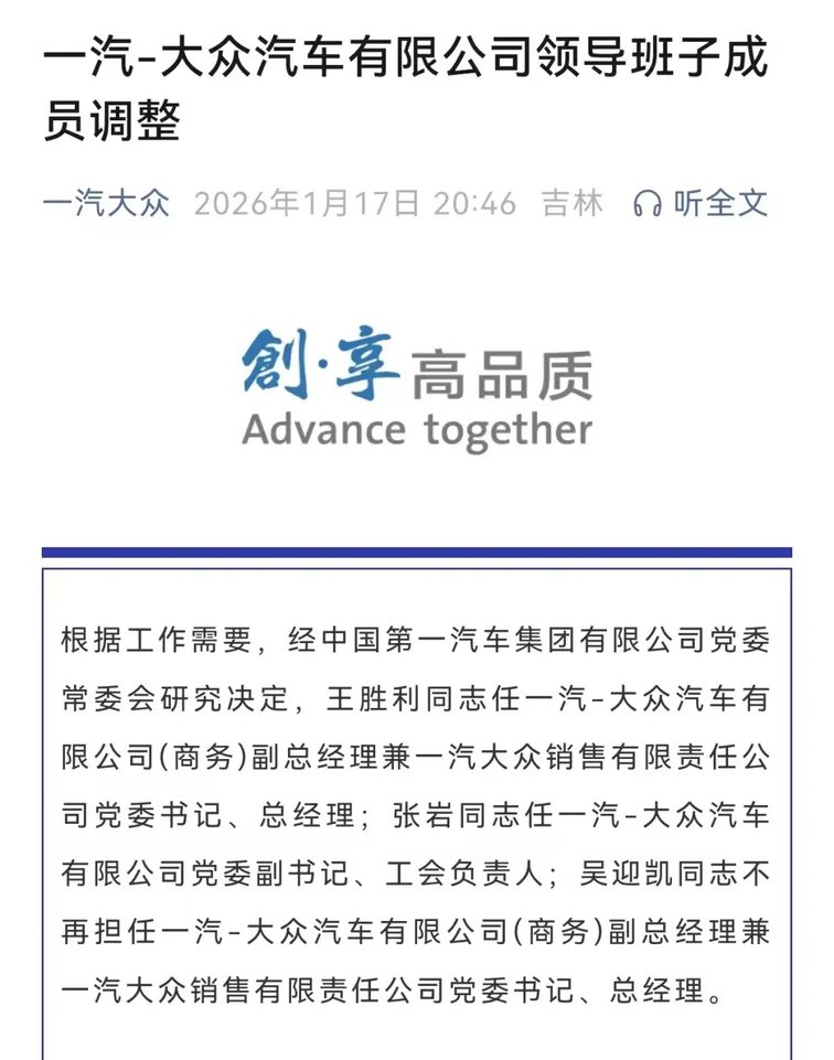 这是继2025年12月31日董修惠出任一汽-大众汽车有限公司党委书记、总经理后的再次人事布局(详见我们当时的报道《华山论剑|一汽再现人事换防,“合资双子星”的守正与新局》),也标志着一汽-大众的核心管理层完成关键“重组”,这家合资标杆企业的转型战役,进入了由董修惠和王胜利这对“黄金搭档”领衔的新阶段。