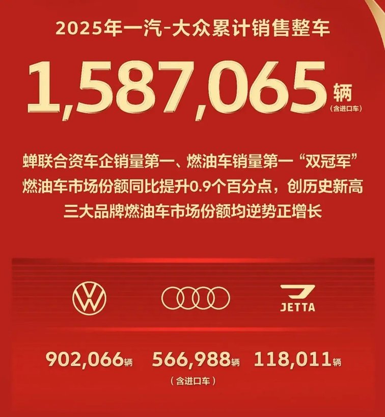 2025年,一汽-大众达成了国内首家产销突破3000万辆的里程碑,并蝉联了合资车企销量第一和燃油车销量第一“双冠军”。数据显示,一汽-大众2025年整车销量158.7万辆(含进口车),其中,大众品牌全年交付整车902,066辆,燃油车市场份额同比提升0.6个百分点,稳居国内燃油车市场第一阵营,为一汽-大众的“突破”之年交出了一份高质量答卷。