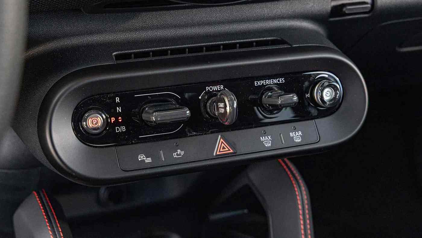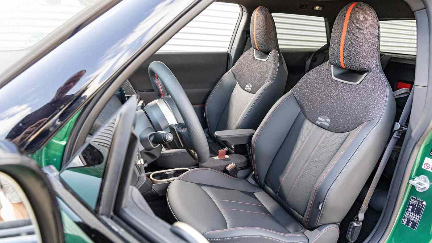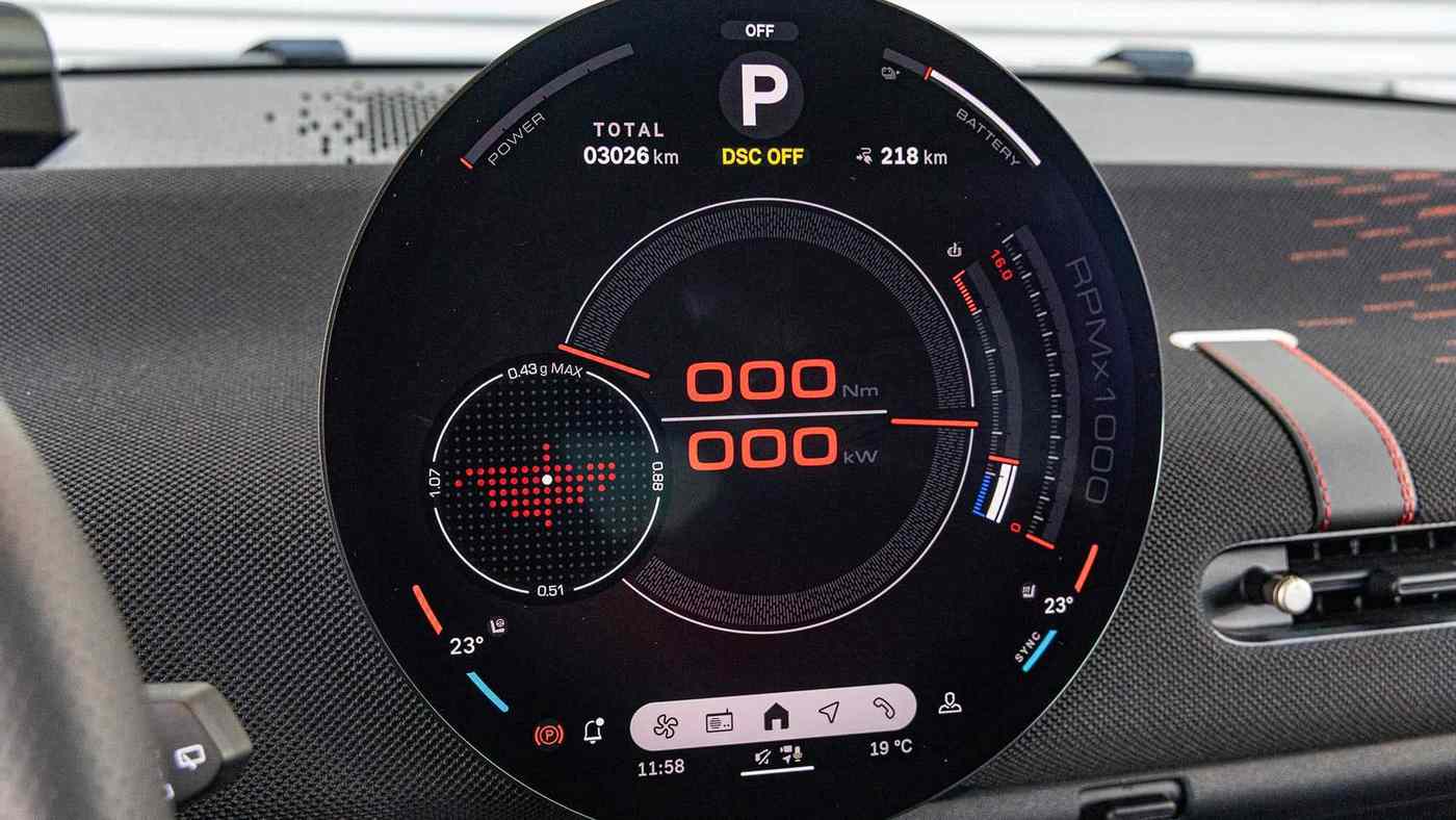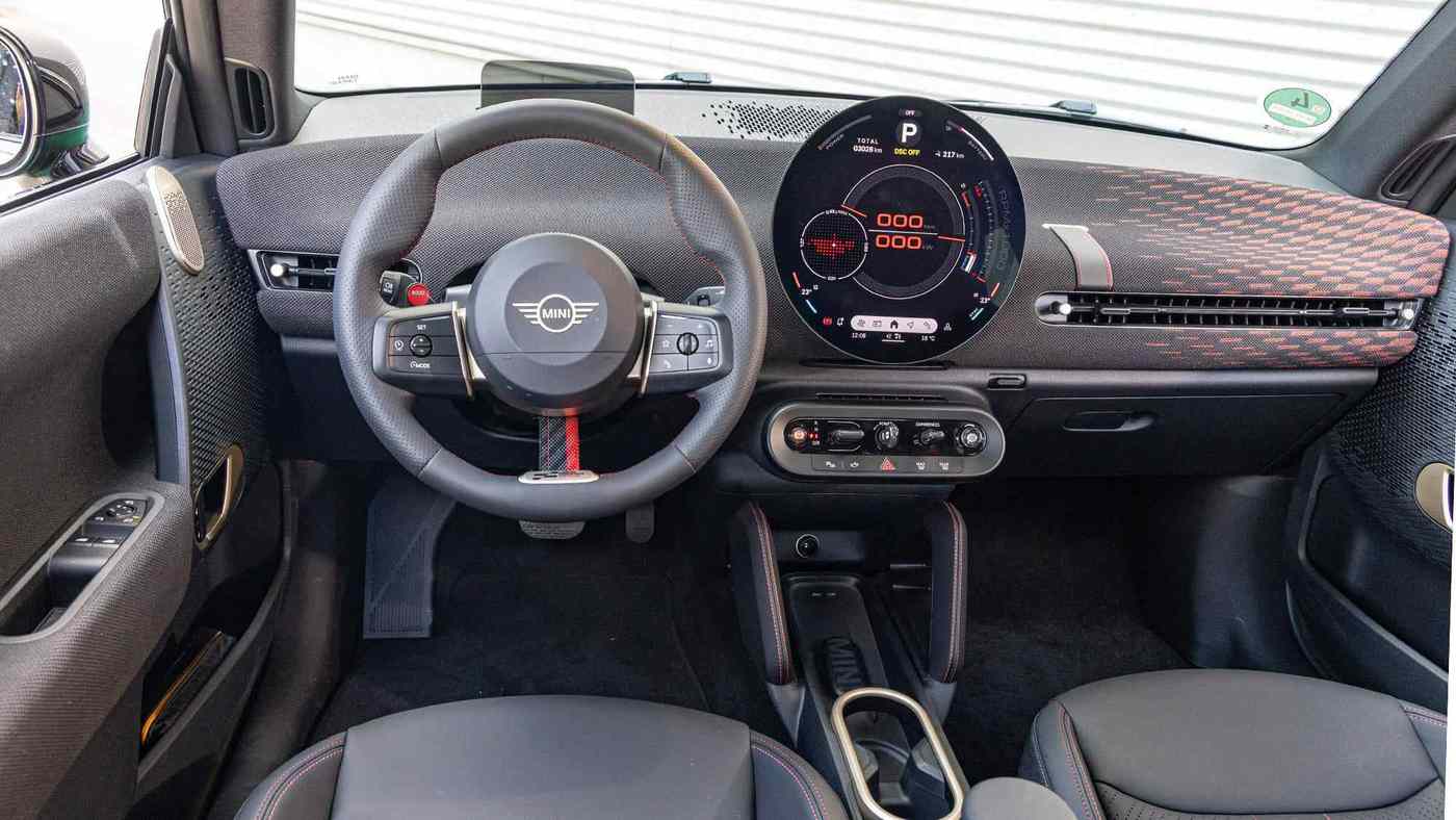 内饰在视觉层面同样充满JCW风格。除了Mini标志性的圆形触控中央显示屏外,车内其余部分都配备了可触摸的实体按键、精致的拨杆开关或旋钮。整体来看,电动MINI JCW提供八种驾驶模式——从不太合适、很酷到略显怪异。不太合适的就算是节能模式,显示屏上会出现一只飞翔的小鸟;怀旧模式则显得很酷,配有复古风格的速度表;切换至JCW模式则略显怪异,扬声器里会播放欢呼声,以及那种极其人工化的行驶声浪。