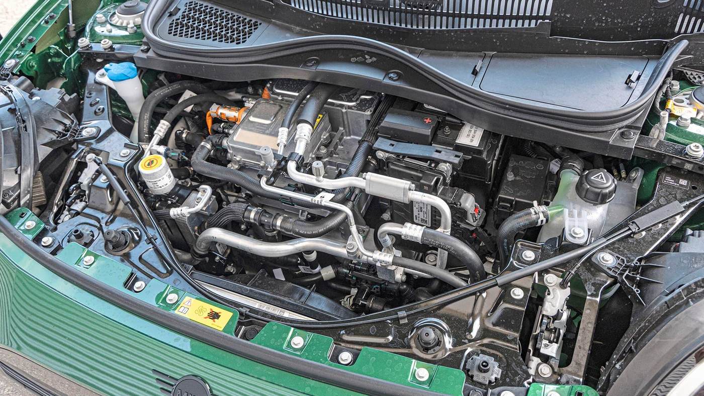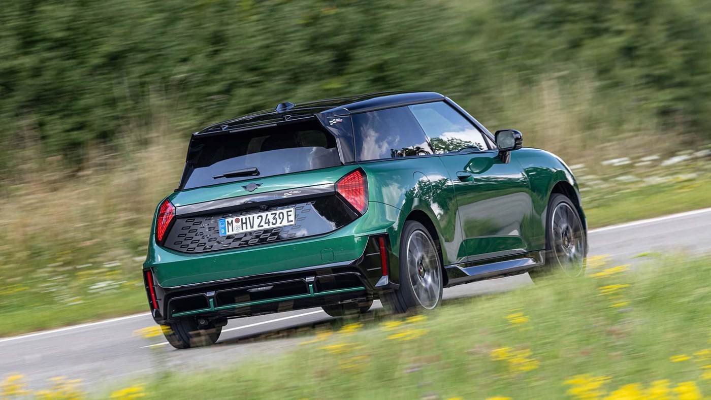 外观上,这台电动车巧妙地借用了JCW辉煌的传统元素。然而在测试中很快显现出,为什么这个名字反而成了一种负担。传统的英国赛车绿车漆、发动机盖拉花以及车顶扰流边翼,这台电动车看起来像是一款名副其实的JCW衍生车型。