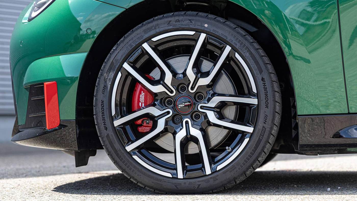 在较晚的制动点,ABS同样表现得相当粗暴。而在加速负载下,MINI会明显地通过前轴推头。标志性的JCW轮圈搭配红色制动卡钳,视觉上充满运动感,但在高强度使用下,制动系统显得略显粗糙。