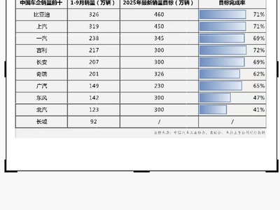 金九银十冲刺期:中国车企最新销量与目标完成率同步披露