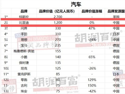 比亚迪4连冠!2025胡润汽车品牌榜出炉,首次纳入非国产品牌