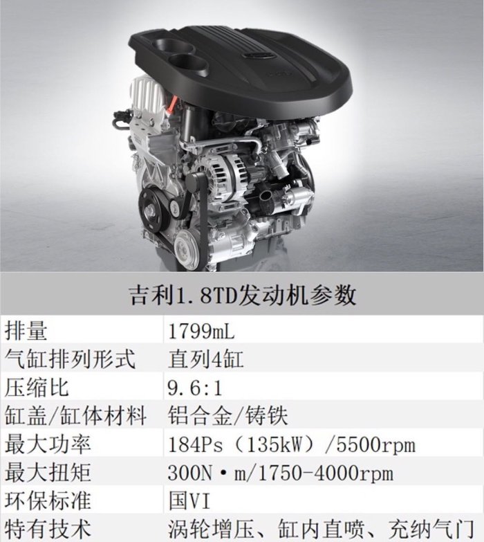 具体来说,吉利1.8TD发动机通过燃烧系统重新开发,缸内直喷技术升级,采用低摩擦活塞、新一代静音链条、集成排气歧管一体式涡轮增压器、双质量飞轮等核心技术,实现了扭矩提升到300N·m,油耗降低3.7%,NVH性能提升5%。