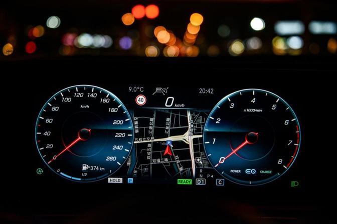 如果非要找一些不同,仪表盘里能看到新的动力系统带来的变化,右下角的EQ、CHARGE、POWER会在不同的动力情况下展现混动的特点。奔驰的HUD是笔者试过这么多台车里最喜欢的,亮度太合适了,白天不会看不见,夜间不会很刺眼,有那么点润物细无声的意境。