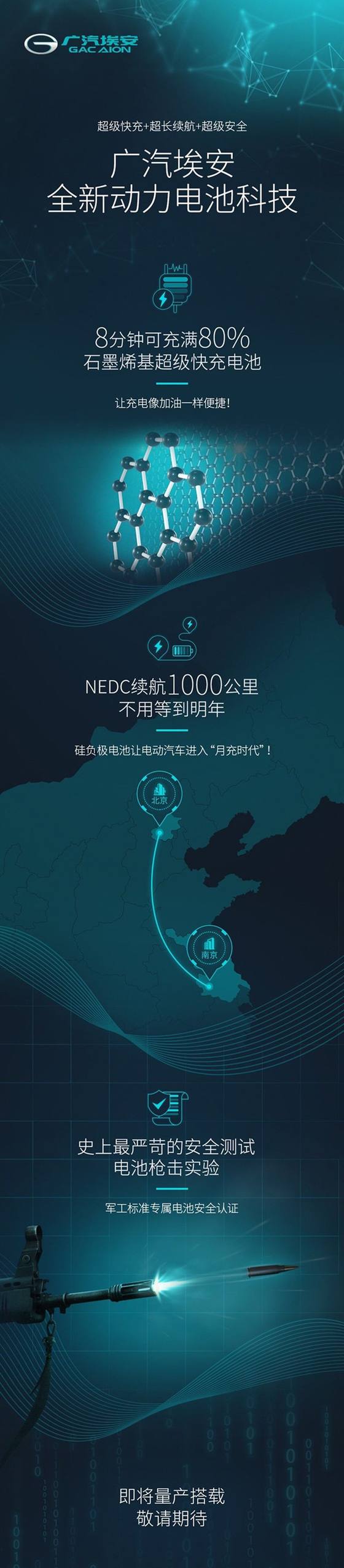 不仅如此,广汽埃安曾在1月15日宣布全新动力电池即将量产。全新石墨烯基超级快充电池,仅需8分钟即可为车辆充至80%电量,NEDC续航里程突破1000公里。