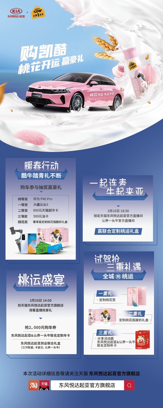 每逢春暖桃花开,似乎也是心动的时刻,小伙伴们都在积极迎接3月桃花运。东风悦达起亚凯酷(K5)为年轻人助力,联合网红牛乳新锐品牌“认养一头牛”,推出“桃花开运,牛起来亚”主题活动,发布“购车、试驾、直播连麦、抢购会”等超多福利,下面是时候公开“桃花开运”秘籍啦!