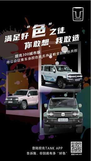 其中,坦克300城市版全新时尚颜色的命名将向网友征集共创。未来,坦克300城市版还将开启全新颜色共创,用户可以通过坦克TANK APP参与发挥自己的创意。