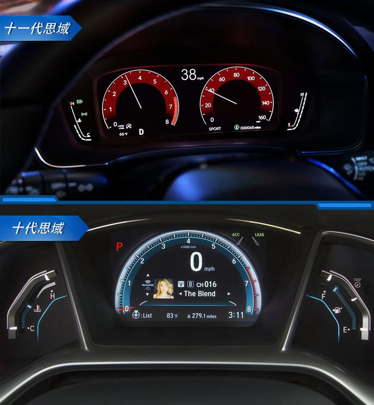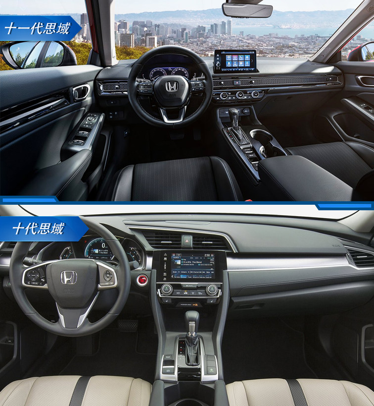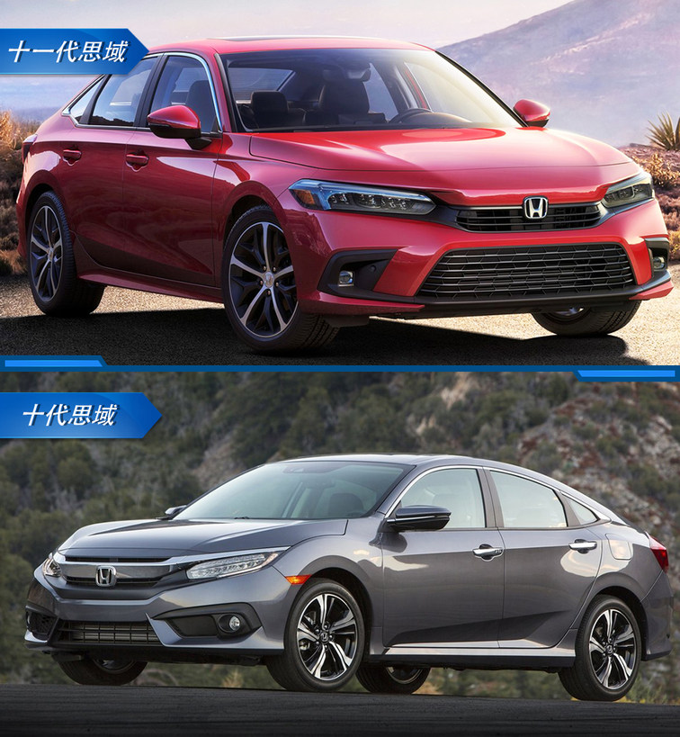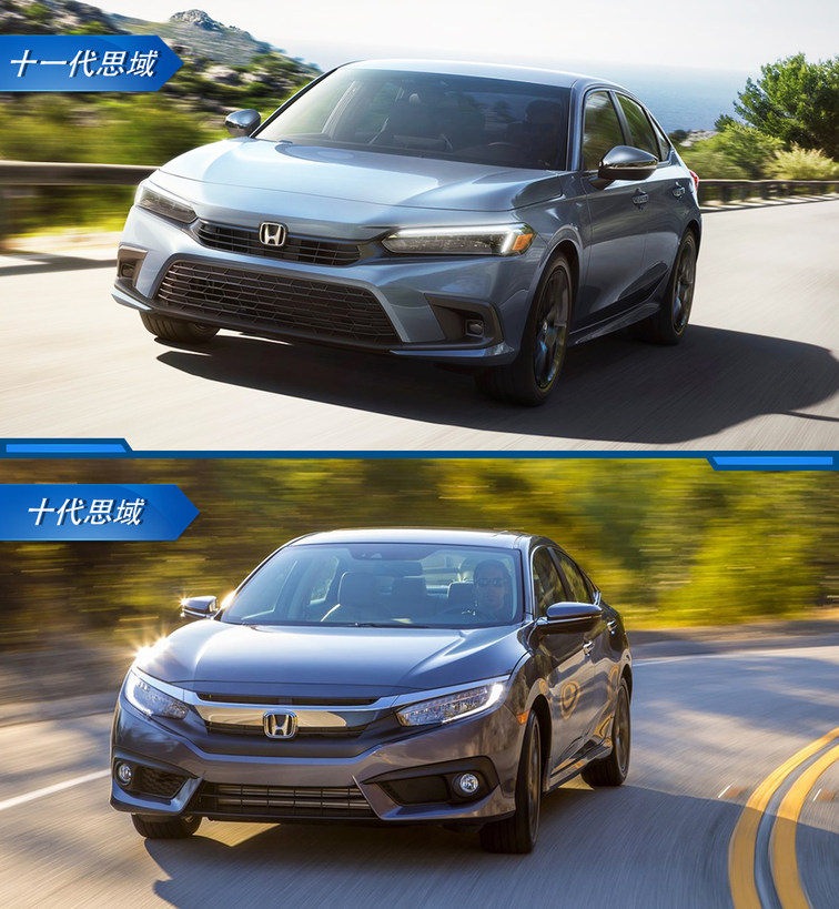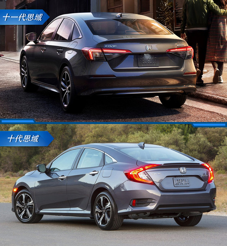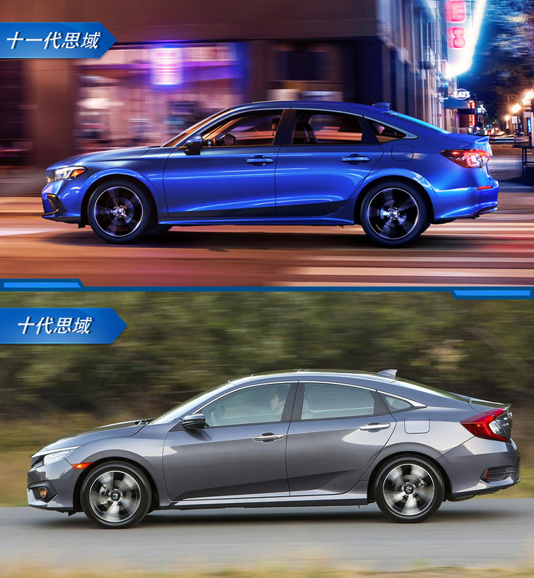 再看车身侧面,十一代思域的腰线更加平直,形面轮廓也更为柔和、优雅,最重要的是,十代思域标志性的溜背造型已被取消。整体来看,十代思域先抑后扬的运动姿态,已无法在十一代思域身上觅见,运动不再是思域的主旋律。
