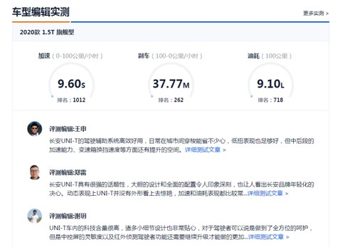 而在网上找了很多UNI-T的零百加速测试,大家测出来的数据都大不相径,有7秒多的,有8秒多的,也有9秒多的。当然厂商发布的数据我们不看,我们只看第三方的,所以我们以汽车之家AH-100体系下的评测结果来作为参考:UNI-T的零百加速时间为9.6秒!