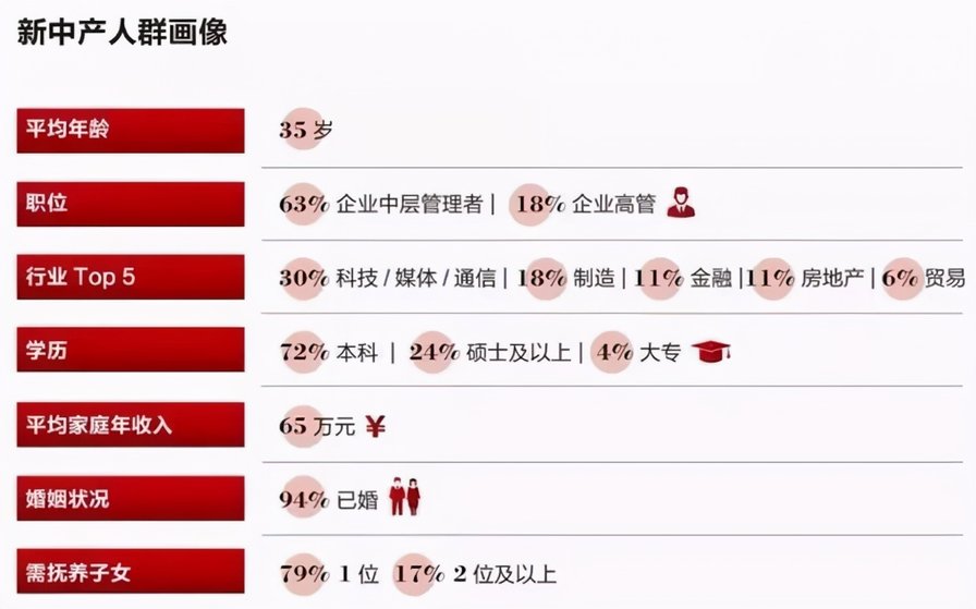 根据Mob研究院《2019新中产焦虑洞察》显示,“新中产”必须符合这三点:①一线城市个人年收入30万元及以上,其他城市20万元及以上;②专科及以上学历;③至少在居住地有一套房产。不难看出,除了可观的经济收入,他们还要有良好的教育水平和稳定的生活环境,