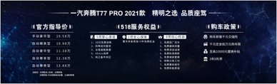 为了进一步强化“以用户体验为中心”理念,以及践行“一切为了客户,一切服务于客户,一切谦敬于客户”的理念的落地,一汽奔腾在奔腾T77 PRO 2021款上市发布会上,为用户带来“518服务权益”。包括5项挚心承诺,1项安心保障以及8项心动权益。其中,5项挚心承诺为30日免费退换,1项安心保障是终身质保以及五年免费机油政策,全力打造用车安心、买车放心、修车省心、养车贴心的全新服务体验。
