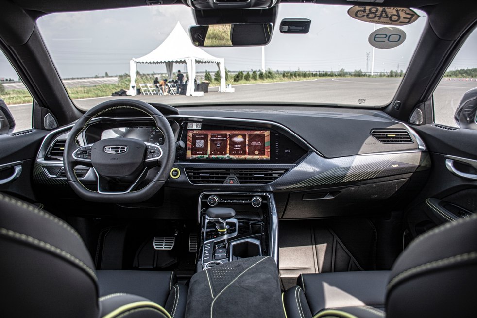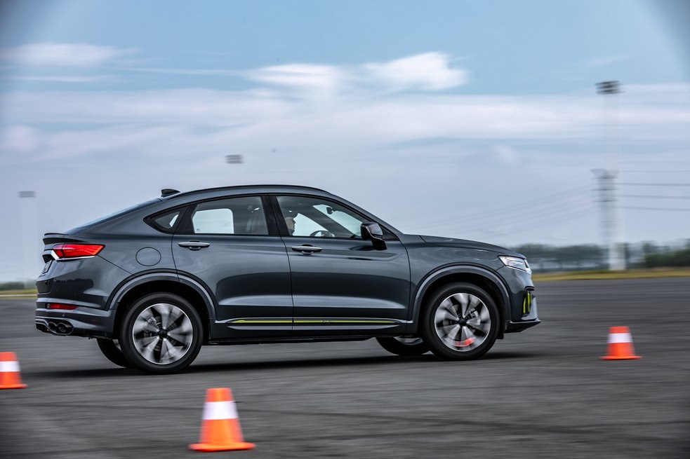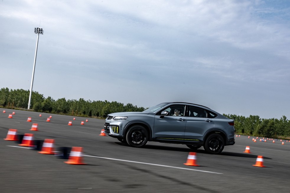 因为是在封闭场地内的试驾,不能体验这台车在应对不同路面时的底盘表现,但,可以判断它在粗沥青路面行驶时,底盘对细小的颠簸过滤很彻底。有人会想,像这样的SUV做性能车,够不够灵活?吉利星越S的转向手感,轻、准,随车速提升手感略微变沉,车尾的跟随性也挺好。