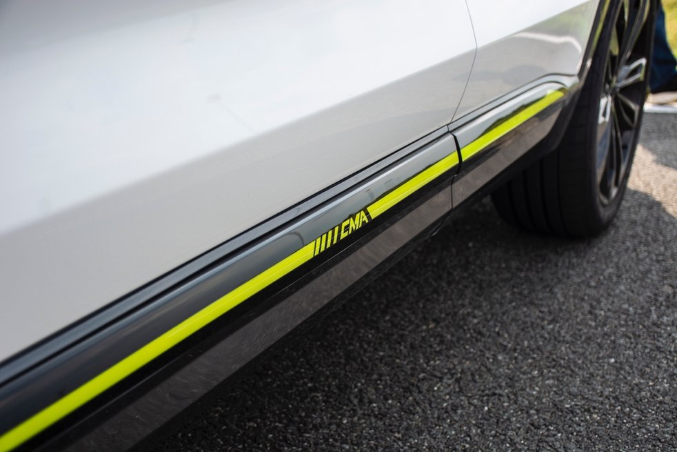 车内主要集中在用料调整,支撑起科技感的双屏设计得以保留,增加的是大量电光绿+CMA字样元素来丰富视觉感受。而且,麂皮在门板、座椅、扶手箱上都有出现;但,如果方向盘能给麂皮材质包裹,那就更好了。