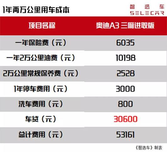 1年保险、车贷、保养费用、停车费以及洗车费用全部算在内的话,奥迪A3一年的花销为53161元。
