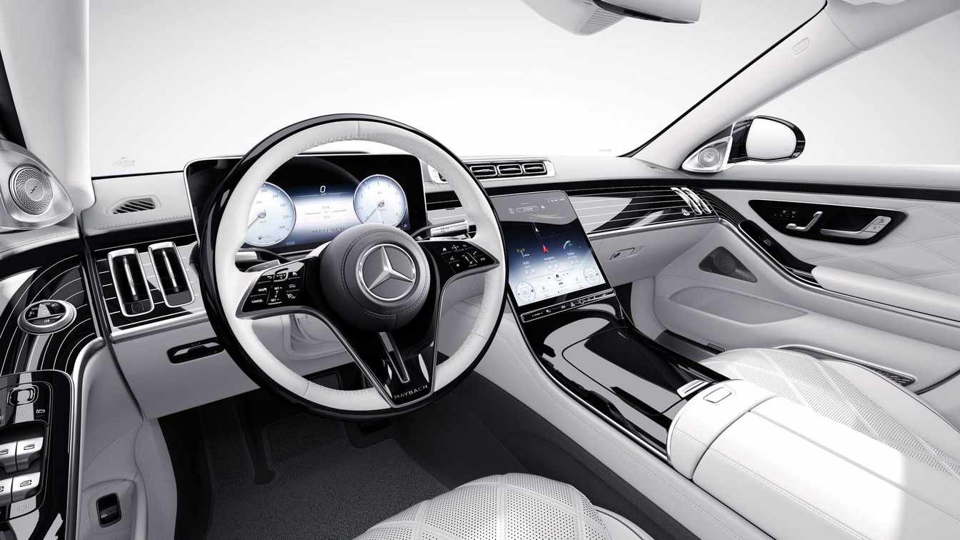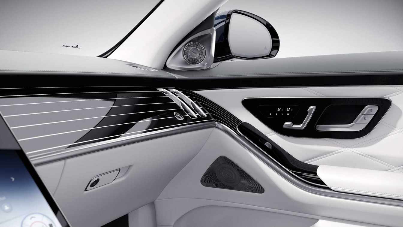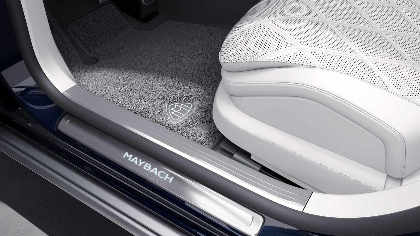 内饰方面配备有悬浮式全液晶仪表盘、垂直布局的大尺寸中控屏以及全新造型的三幅式多功能方向盘,但用料方面相比奔驰S级要更豪华一些。配色方面则采用了水晶白搭配珍珠银灰色双拼布局,而且还使用了真皮材质进行包裹,而且内饰部分位置还加入了100周年相关标志。