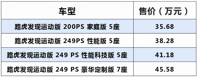 路虎发现运动版共发布四款车型,官方指导价格区间是35.68万元—45.58万元。