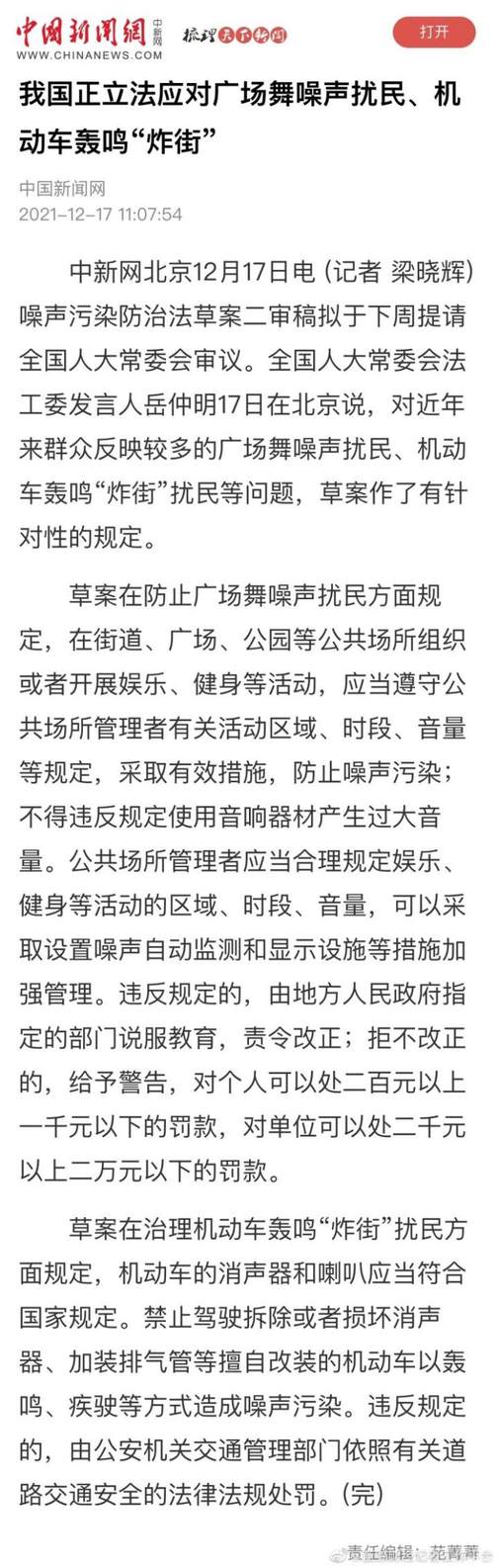 日前,我们从中国新闻网处了解到,噪声污染防治法草案二审稿拟于下周提请全国人大常委会审议,全国人大常委会法工委发言人表示,对近年来群众反映较多的广场舞噪声扰民、机动车轰鸣“炸街”扰民等问题,草案作了有针对性的规定。