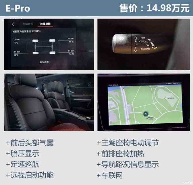 E-Pro作为车辆的顶配车型,比E-Plus贵了1万元,相应增加了很多舒适性配置,不过仔细看来,作为一款十几万的纯电动车,座椅加热意味着续航会有所影响,而定速巡航多用于高速长途使用,但纯电动车大多用于城市,利用率不高。而车联网功能完全可以由CarPlay代替。相比之下胎压显示和远程启动提前热车会是比较实用的功能,不过整体来看,E-Pro的性价比不如E-Plus高。