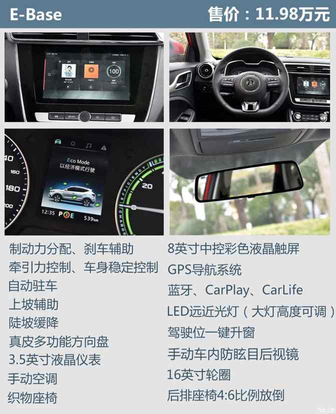 E-Base的配置基本可以满足平时的使用需求,论科技感,CarPlay功能集成了音乐、导航等许多中控内容、8英寸的中控触屏和LED远近光灯让这款车从里到外都很有档次感,上坡辅助、陡坡缓降、牵引力控制、制动力分配,这些又能满足人们日常驾驶的安全需求,唯一的小遗憾就是没有前后驻车雷达和倒车影像,但是后期加装也不是难事儿,因此我给E-Base五星推荐。如果是前一万名用户,在有1万元优惠的情况下,推荐选择E-Lite车型,因为此时增加的倒车影像、前后驻车雷达、无钥匙进入、USB接口等设备相当于是免费奉送,这样算来就很是划算了。