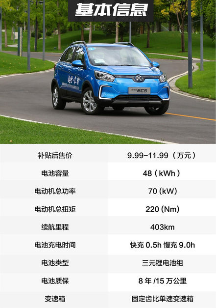相比前款ex360(nedc综合续航318km)的续航能力,ec5的续航提升了不少,nedc综合续航达到了403km,这要得益于新车配备的北汽新能源emd2.0pro智能电控系统、onepedal单踏板设计,以及容量为48kwh的电池组等。值得一提的是,ec5还搭载了充电时低温预加热系统,解决了电动车低温充电难的问题,而且电池还提供8年/15万公里质保。