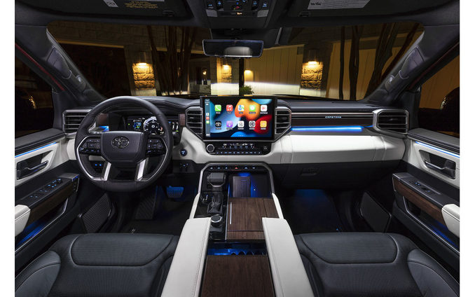 外观方面,新车的前格栅和前大灯组设计与新坦途基本相同。但梯形格栅内部提供横幅式、黑色蜂窝式和镀铬蜂窝式三宗不同设计风格。前包围样式也更加粗壮,采用了分层式设计并加入了下护板。新车侧面腰线、轮眉都起伏明显,显得更加运动。A、B、C柱都采用隐藏式设计,营造出悬浮车顶的效果。看起来霸气十足。