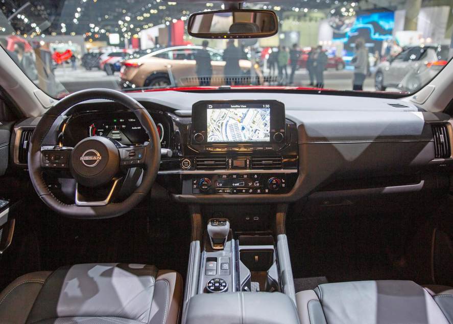 内饰部分也是全新的设计方案,但与日产其他车型比起来,全新Pathfinder的中控台保留了不少实体按键,看上去多了一些复古韵味。方向盘用了全新的三辐平底样式,使得车内又多了几分动感。值得一提的是,这套座舱可以实现三屏联动,它带有12.3英寸全液晶仪表盘+10.8英寸HUD抬头显示+9英寸悬浮式中控屏。在以实用性为主的中控台设计中,融合了智能化的操作方式,这点算是全新Pathfinder比较重要的亮点,毕竟现在中大型SUV的车主也呈年轻化趋势。