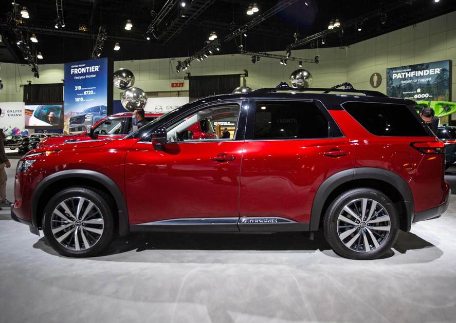 车身侧面则沿用传统中大型SUV的线条,整体轮廓显得横平竖直,比例较为规整硬朗。但是,新车也有不少凸显潮流的设计元素,比如新车用了双色车身设计,车顶的悬浮感很强。此外,全新Pathfinder的侧裙部分也很有设计感,并非装上一套黑色塑料包围就完事儿,细节造型显得非常精致。此外,全新Pathfinder的C柱造型很有特色,这种设计应该是从游艇上汲取的灵感。当然,像奔驰GLE、福特探险者、雪佛兰探界者等等这类“美式SUV”,也能看到类似的设计。