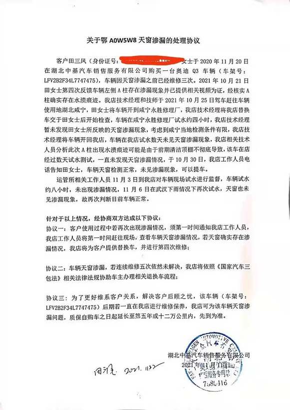 10月25日,4s店工作人员表示今天田女士的爱车在咸宁永胜那边一直淋水测试检漏,未发现漏水痕迹。随后给出了处理协议,协议表明相关技术人员判断此次A柱再次渗漏并出现水迹原因是因为之前维修遗留问题,排水管堵住导致再次渗水并出现渗水痕迹。到10月30日,以上渗水问题已经处理好,并电话告知田女士目前车辆天窗渗水问题已经解决,可以提车。
