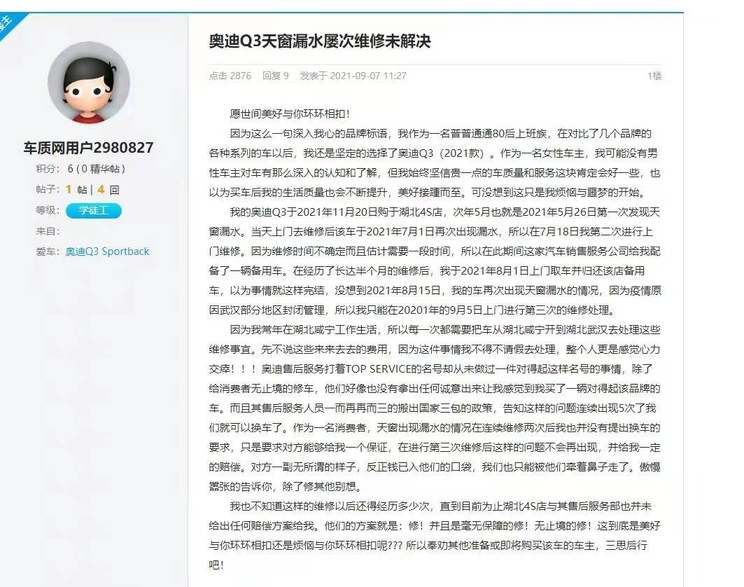 世间烦恼环环相扣!全新奥迪Q3天窗漏水是修了还是没修?
