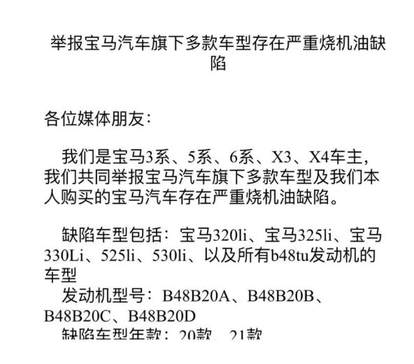 除此之外,他们还发现,宝马3系、5系、6系、X3、X4都存在烧机油的问题。在一封名称为《举报宝马汽车旗下多款车型存在严重烧机油缺陷》的信中,近百名宝马车主集体举报宝马汽车旗下多款车型及其本人购买的宝马汽车存在严重烧机油缺陷。