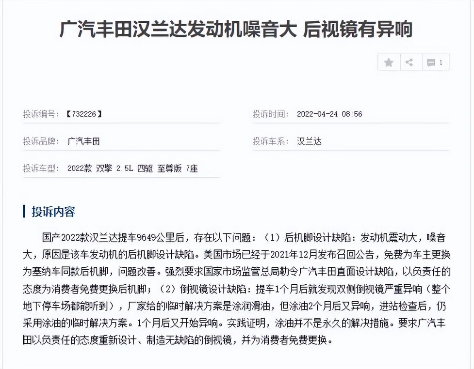 一位2022款汉兰达车主投诉称:国产2022款汉兰达提车9649公里后,存在以下问题:(1)后机脚设计缺陷:发动机震动大,噪音大,原因是该车发动机的后机脚设计缺陷。美国市场已经于2021年12月发布召回公告,免费为车主更换为塞纳车同款后机脚,问题改善。强烈要求国家市场监管总局勒令广汽丰田直面设计缺陷,以负责任的态度为消费者免费更换后机脚;(2)倒视镜设计缺陷:提车1个月后就发现双侧倒视镜严重异响(整个地下停车场都能听到),厂家给的临时解决方案是涂润滑油,但涂油2个月后又异响,进站检查后,仍采用涂油的临时解决方案。1个月后又开始异响。实践证明,涂油并不是永久的解决措施。要求广汽丰田以负责任的态度重新设计、制造无缺陷的倒视镜,并为消费者免费更换。