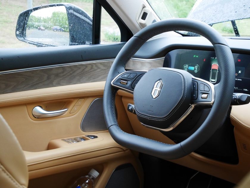 越看越高级的外观造型,线条的运动恰到好处,就连AITO的车标都透着一股艺术气息。这次我们拿到的试驾车是黑色车身配米色内饰,更显成熟稳重。亮起的车灯在雨后带有一点朦胧感,也是一种浪漫。