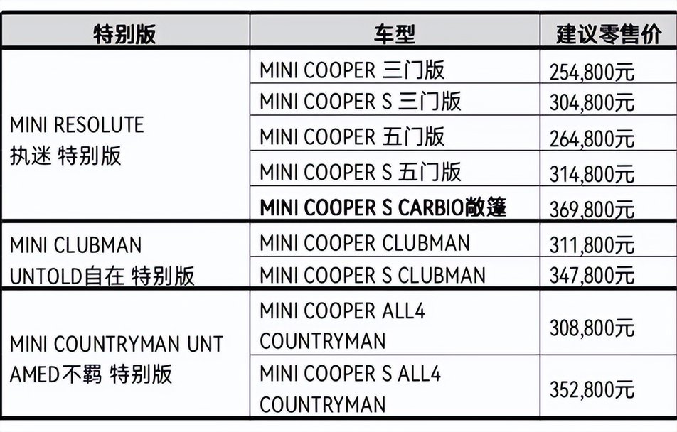 5月19日,MINI发布了MINI CLUBMAN UNTOLD自在特别版官图。在此之前,新车已经于全球同步上市,其中包括MINI RESOLUTE执迷特别版、MINI CLUBMAN UNTOLD自在特别版和MINI COUNTRYMAN UNTAMED不羁特别版,起售价格为25.48万元,其中自在特别版官方指导价为31.18万元-34.78万元。