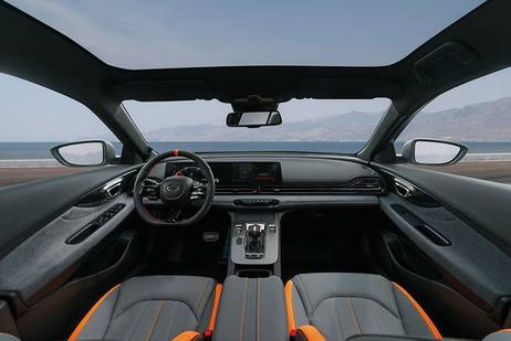 影豹R-style赛道版采用了灰橙撞色的内饰设计,大量超纤麂皮材质的使用,进一步激发驾驶欲望。和影豹一样,它也采用经典的环抱座舱设计,同时还有贯穿式空调出风口,环绕式主仪表台软包,延伸视觉宽度。