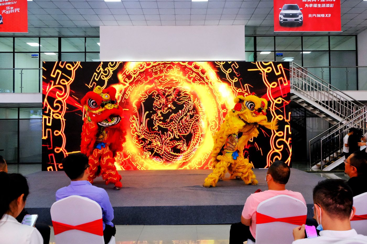 其中,舞狮开场包括了具有寓意的点睛环节,两位相关领导顺利对舞狮进行点睛,表达美好祝愿。会上,重庆北汽瑞翔汽车销售有限公司副总经理邱阳向四川宝瑞达新能源汽车有限公司总经理陈强授牌并表达祝贺。