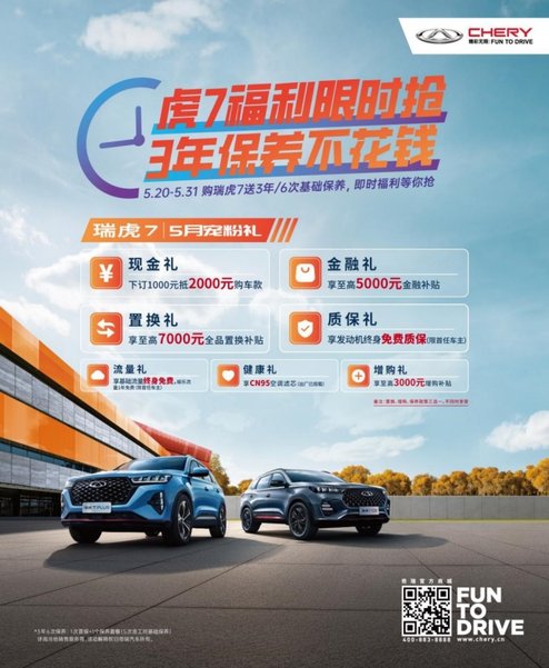 奇瑞推出新的保养福利政策,2022年5月20日-5月31日期间,参与“虎7福利限时抢,3年保养不花钱”活动,购瑞虎7全系车型送3年/6次基础保养。同时,用户还可享受七重礼,如下订1000元抵2000元购车款、至高5000元金融补贴、至高7000元全品置换补贴、发动机终身免费质保(限首任车主)、基础流量终身免费、娱乐流量1年免费(限首任车主)等。