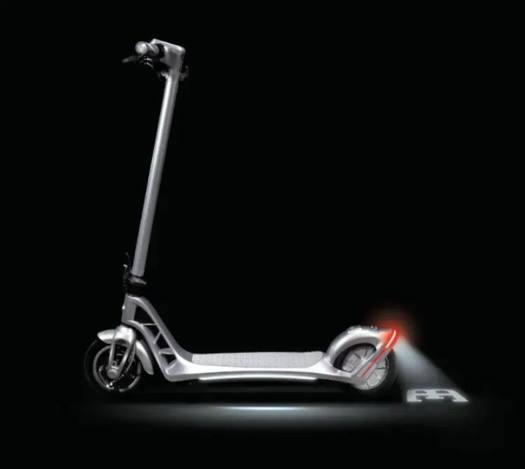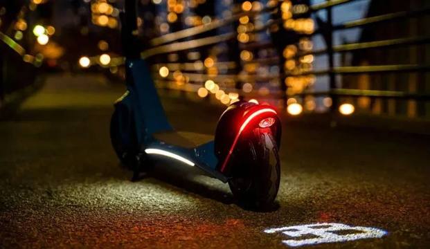 这款电动滑板车拥有布加迪风格的蓝色涂装(还有黑色、银色可选),在车头有布加迪的标识表明其身份。拥有闪光灯、车身氛围灯、刹车灯等配置,尾灯还能投影,一到晚上,硕大的“EB”标识随车而动,不拉风都不行。此外,还有LED屏显示速度和电量。