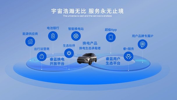 在服务上,睿蓝换电生态圈以用户为中心,紧扣“1+1”模式,打造线上线下齐发展的融合型生态。即睿蓝换电产业开放平台和用户生态平台,两个平台相互赋能,共同发展,创造更丰富、更人性化的服务和体验。睿蓝换电产业开放平台可实现渠道、产业、模式的全维度开放,加之换电站、终端店的广布和紧密配合,让睿蓝可以更好的服务每一个用户。睿蓝用户生态平台旨在为用户打造更便捷的换电生活圈,秉承“让用户享用换电科技,探索生活无限可能”的核心价值,以超级App、用户专属品牌IP、睿+服务三大利器为核心,重构“人、车、站、云”关系,打造新生态,创造更美好的换电轻生活体验。