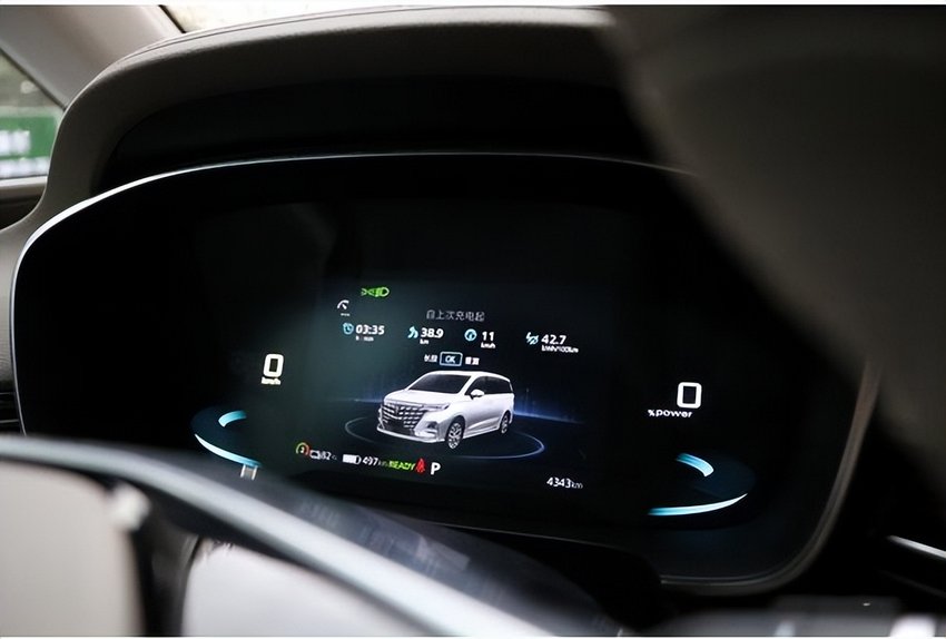 荣威iMAX8 EV均配备了12.3英寸的全液晶仪表盘,提供大部分的车辆行驶信息,除了包含速度、转速、公里数、电量、胎压等基础信息外,还支持与中控屏联动,实景导航等,可通过方向盘的多功能键来切换操作。