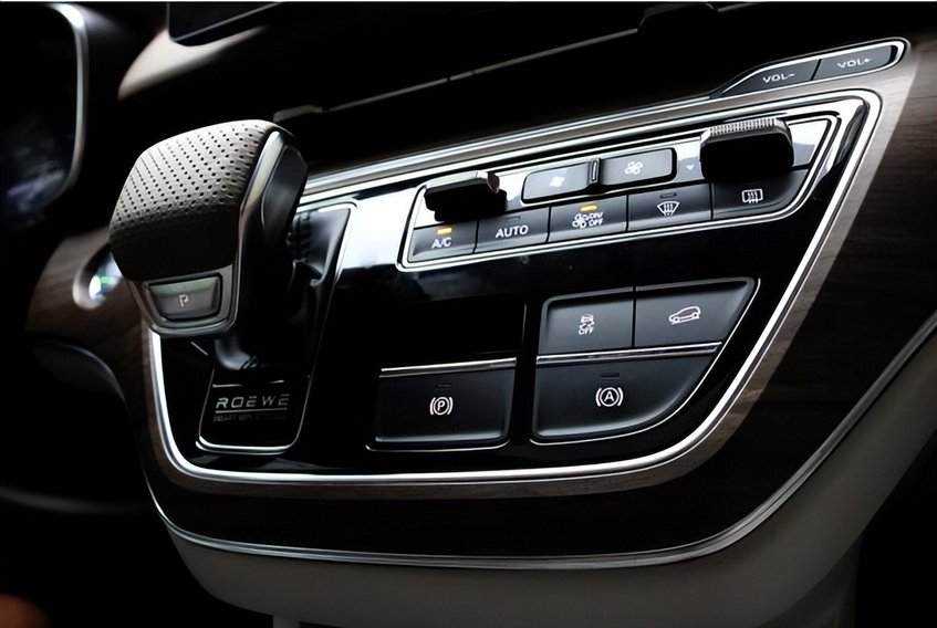 荣威iMAX8 EV将电子档把设置在中控屏下方,在档把右侧集成了空调、电子手刹、自动驻车、陡坡缓解等物理按键,操作简便,有着怀旧的质感。
