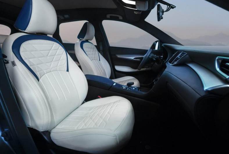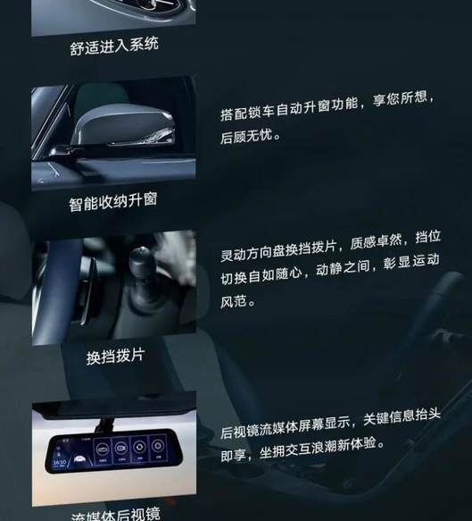 内饰方面,整体配色以白色搭配蓝色为主,同时针对配置进行了一定的优化,提供有换挡拨片、流媒体后视镜、锁车自动升窗、舒适进入、前排手机无线充电、迎宾灯等配置。