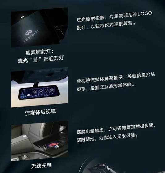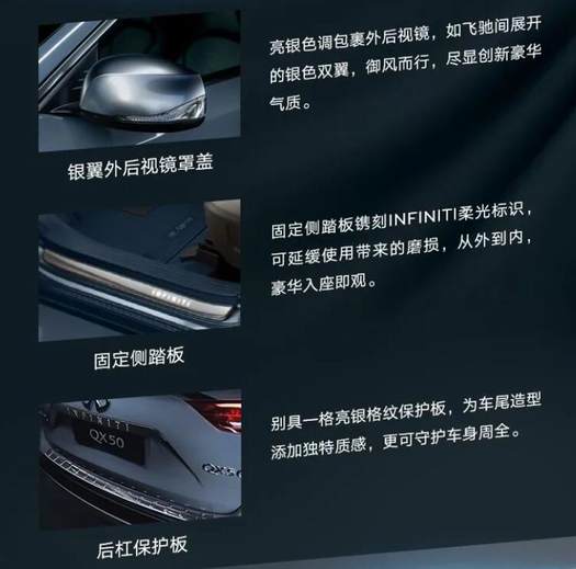 细节方面,两款新车都加入了专属的银色外后视镜,QX50还加入了后备箱镀铬银纹保护板,彰显了独特的身份。