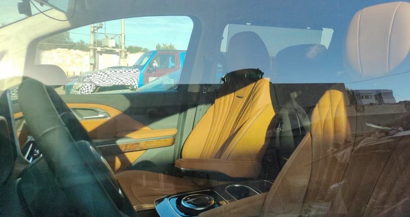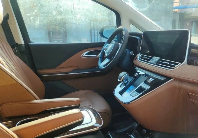 车内是典型的2+2+3的7座布局,三幅式方向盘加上全液晶的仪表盘,还有无线充电和触摸屏。第二排带有睡眠头枕和电动腿托,属于MPV的常规操作。