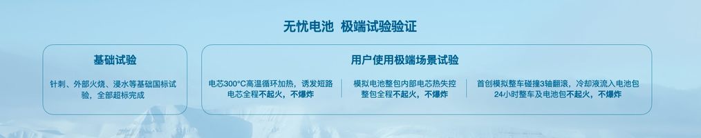好的设计和好的产品,更需要结果来验证。“无忧电池”除了在针刺、外部火烧、浸水等基础国标试验中表现优异,还在电芯高温短路场景、电池整包热失控场景,以及行业内首创的模拟整车极限碰撞翻滚试验等大量严苛使用场景下的验证中,做到不起火,不爆炸。