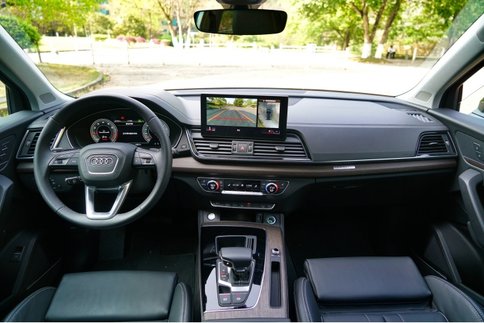 这种感觉坐进车内会更加明显。Q5L相比A6L和A4L好的一点是,它没有采用三块屏的设计,依旧在空调控制区保留了大量物理按键,保证了日常使用的便利性。但两块屏幕的UI设计和奥迪其它车型一样,仍然是机械感很重的、很冷很硬的风格。加上内饰以黑色为主,伴随暗色木纹面板点缀,整体内饰氛围有些暗黑。