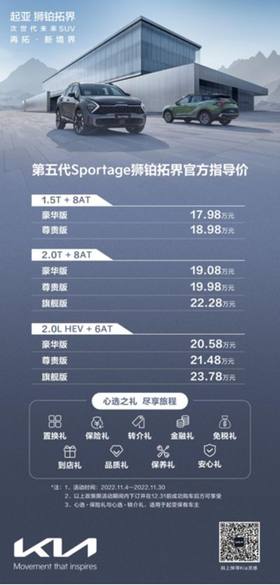 第五代Sportage狮铂拓界汇聚起亚全球领先技术,专为中国消费者焕新而来。狮铂拓界于11月3日上市,官方指导价为17.98万元-23.78万元,并带来置换礼、保险礼、转介礼、金融礼、免税礼、到店礼、品质礼、保养礼、安心礼等九重购车心选礼遇。新车基于起亚全新的第三代i-GMP平台打造,产品力全维升级,拥有个性前卫、自然感性的外观,充满科技感、未来感的内饰,充分迎合年轻群体的时尚审美;4670mm车长和2755mm轴距,以及1000mm的超长后备箱,带来领先同级的宽适驾乘空间;提供1.5T+8AT、2.0T+8AT、2.0L+6AT(HEV) 三套高性能动力组合,能够满足用户多样化需求;全系标配10项核心ADAS智能驾驶辅助系统,搭载了Kia Connect智能互联系统,打造更具未来感的智能出行体验;并且前挡风前排车窗整体采用双层隔音玻璃和多项隔音吸音材料,以及丰富周到的高端舒适便利配置,打造温馨安逸的驾乘生活。对于年轻消费者而言,狮铂拓界如同一名“六边形全能战士”,更好满足他们日益多元化、个性化的需求,成为当下MZ世代选购合资中型SUV的理想之选。